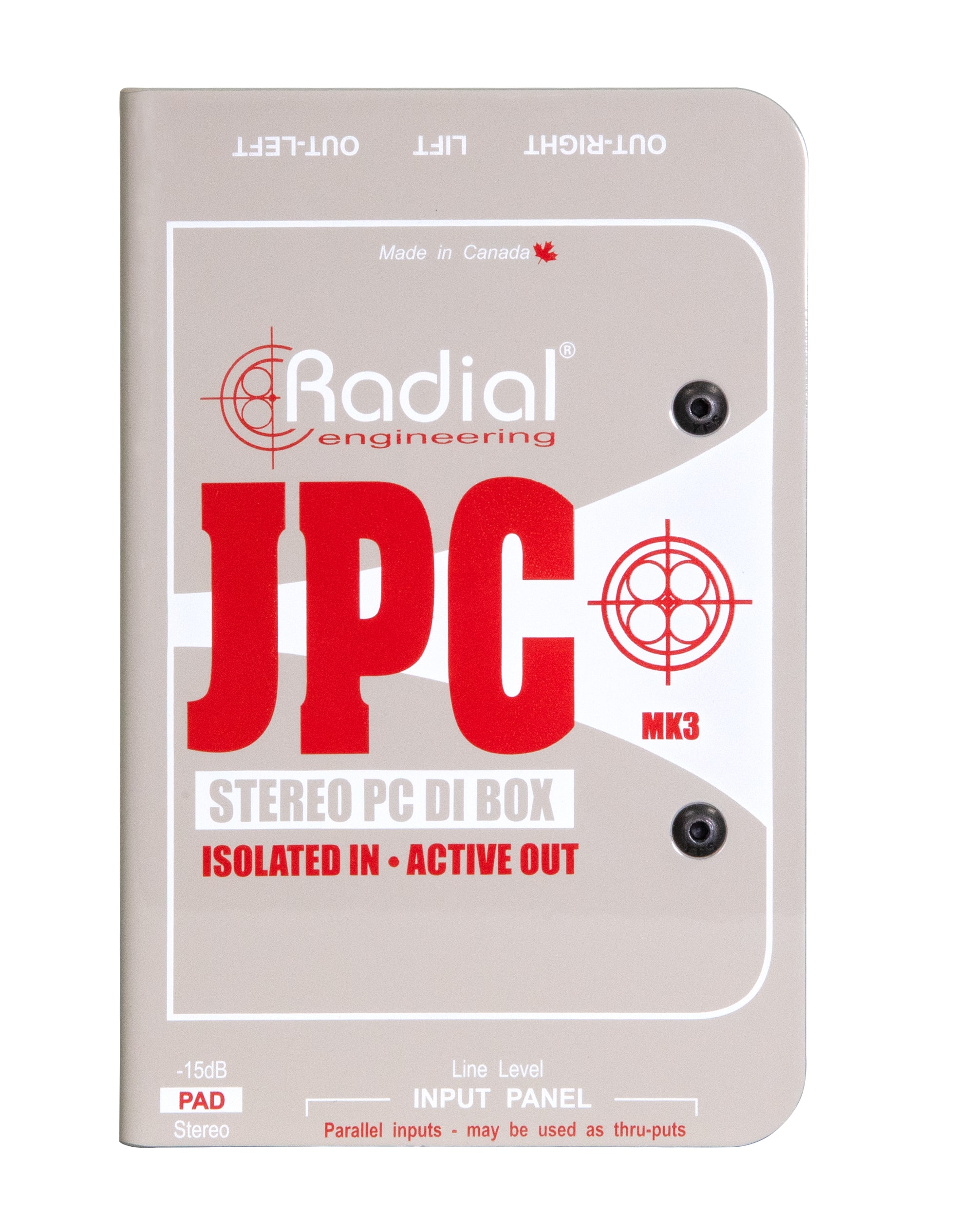 The Radial JPC is a professional active stereo DI box designed specifically for consumer audio devices such as laptops, CD players, tablets, and media players. It safely converts unbalanced stereo signals into balanced XLR outputs while providing proper impedance matching and level control for clean, noise-free audio in professional sound systems.