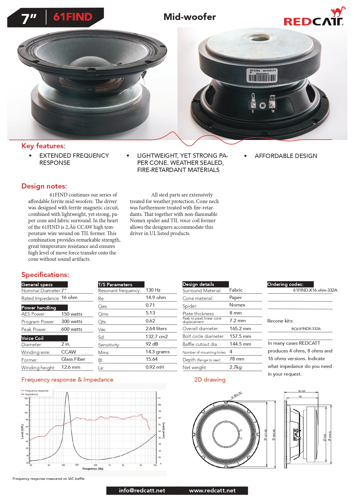 61FIND continues our series of affordable ferrite mid-woofers. The driver was designed with ferrite magnetic circuit, combined with lightweight, yet strong, paper cone and fabric surround. In the heart of the 61FIND is 2” CCAW high temperature wire wound on TIL former. This combination provides remarkable strength, great temperature resistance and ensures high level of move force transfer onto the cone without sound artifacts. All steel parts are extensively treated for weather protection. Cone neck was furthermore treated with fire-retardants. That together with non-flammable Nomex spider and TIL voice coil former allows the designers accommodate this driver in UL listed products.