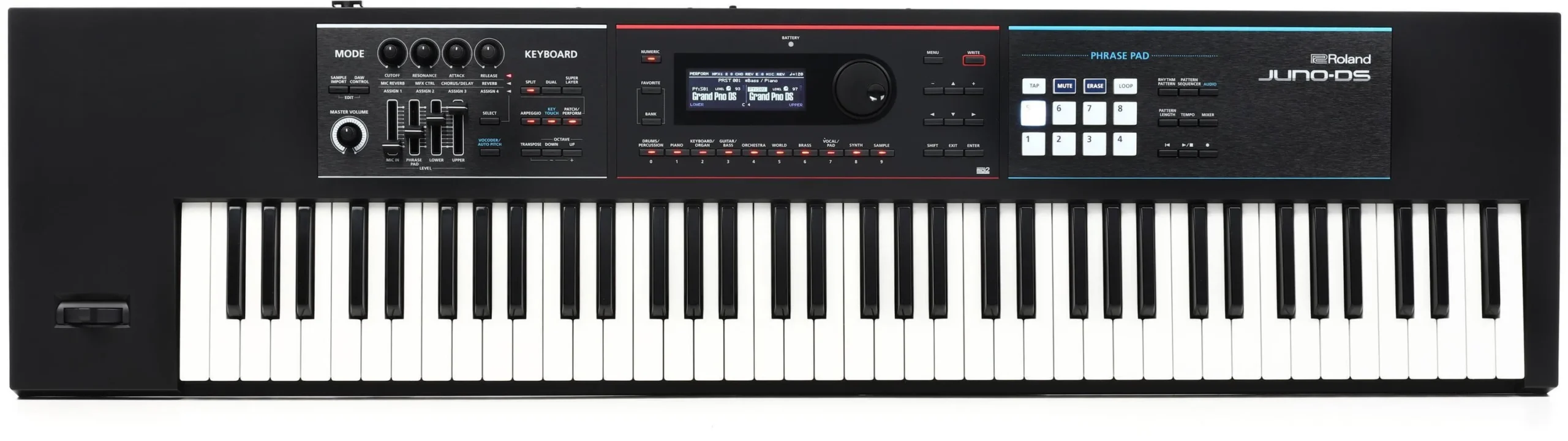 The Roland JUNO-DS76 expands on the JUNO series’ performance heritage with an extended 76-note keyboard for players who prefer a broader range. It delivers professional sound, intuitive operation, and flexible performance capabilities in a lightweight, gig-ready design.