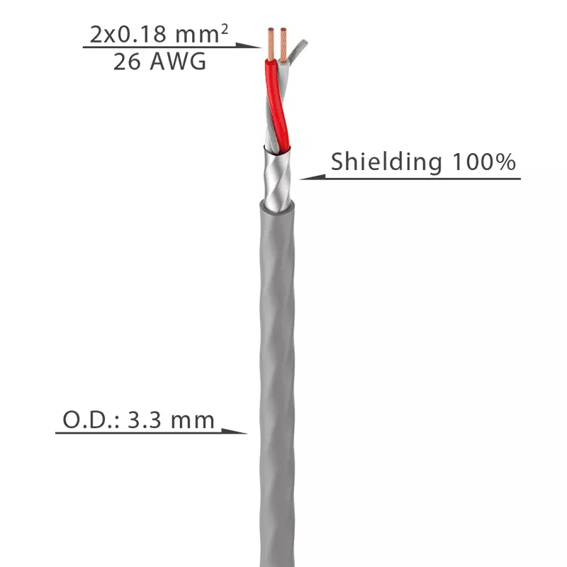A balanced patch cable designed for installation, boasting a 26AWG construction and 2 x 0.18 mm², features a very thin PVC jacket with a diameter of 3.3 mm, ideal for cabinet wiring to optimize space, coupled with durability ensured by a robust PVC jacket, and enhanced electrical performance and tensile strength thanks to special LLDPE insulation. Moreover, its exceptional shielding, provided by AL fleece and drain wire, ensures optimal signal integrity, while its highly flexible nature, facilitated by professional stranded wire technology, caters to diverse installation needs. Primarily suited for internal rack wiring, as well as audio and HiFi components, it comes in two sleek colors: Grey and Black.