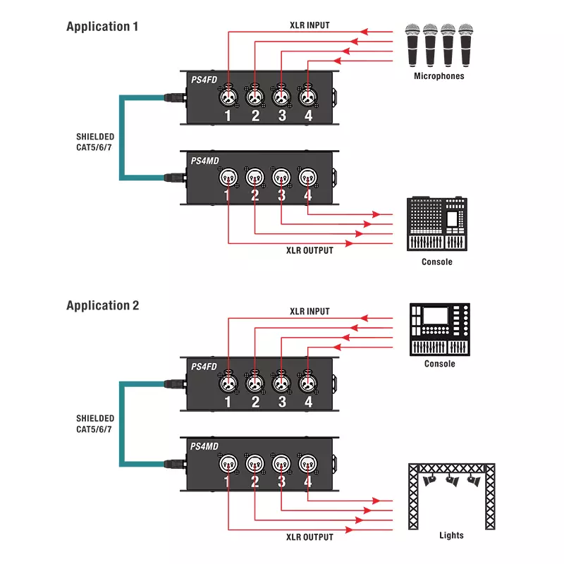 - Used to connect a single shielded CAT5,5E,6,6A or 7 cable to transmit and receive multiple lighting consoles, microphones, musical instrument, speakers, and other audio signals for the compact convenience of transmitting multi-channel digital signals or analogue balanced signals