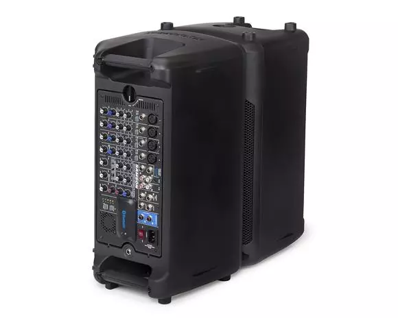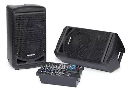 The XP800’s speaker enclosures feature a tilt-back design so they can be used as stage monitors, as well as 1 3/8″ speaker stands mounts. The mixer section can be removed and mounted on any standard mic stand using Samson‘s SMS308 Mixer (sold separately).