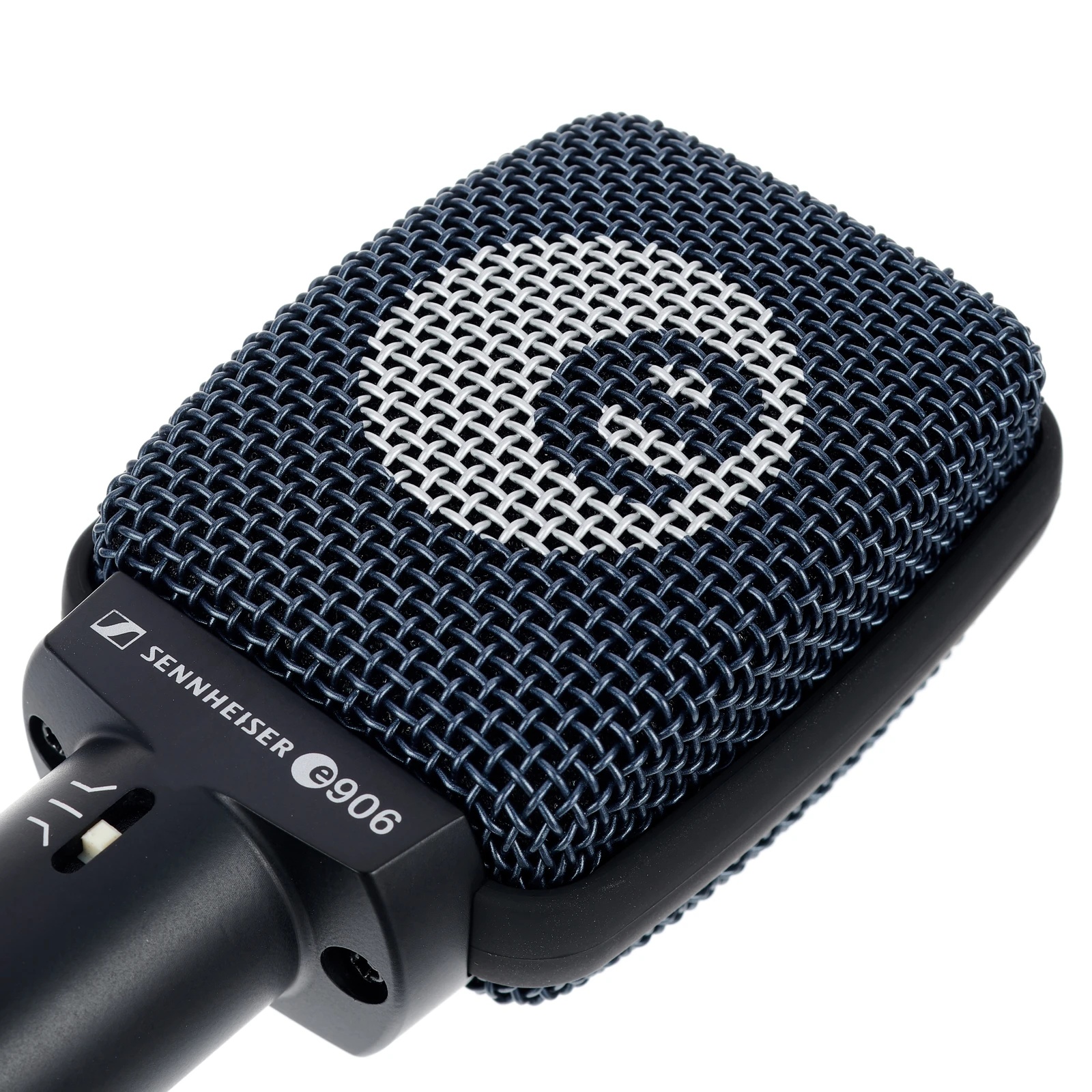 The Sennheiser E 906 is a studio/tour-ready dynamic super-cardioid microphone designed specifically for guitar cabinets, snares, toms and other loud sources. With a flat, side-address capsule design and specialised switchable response settings (flat, presence, lead), it offers exceptional versatility and sound shaping capability. Its solid build and clear, punchy tone make it a popular choice for both live stage and studio recording applications.
