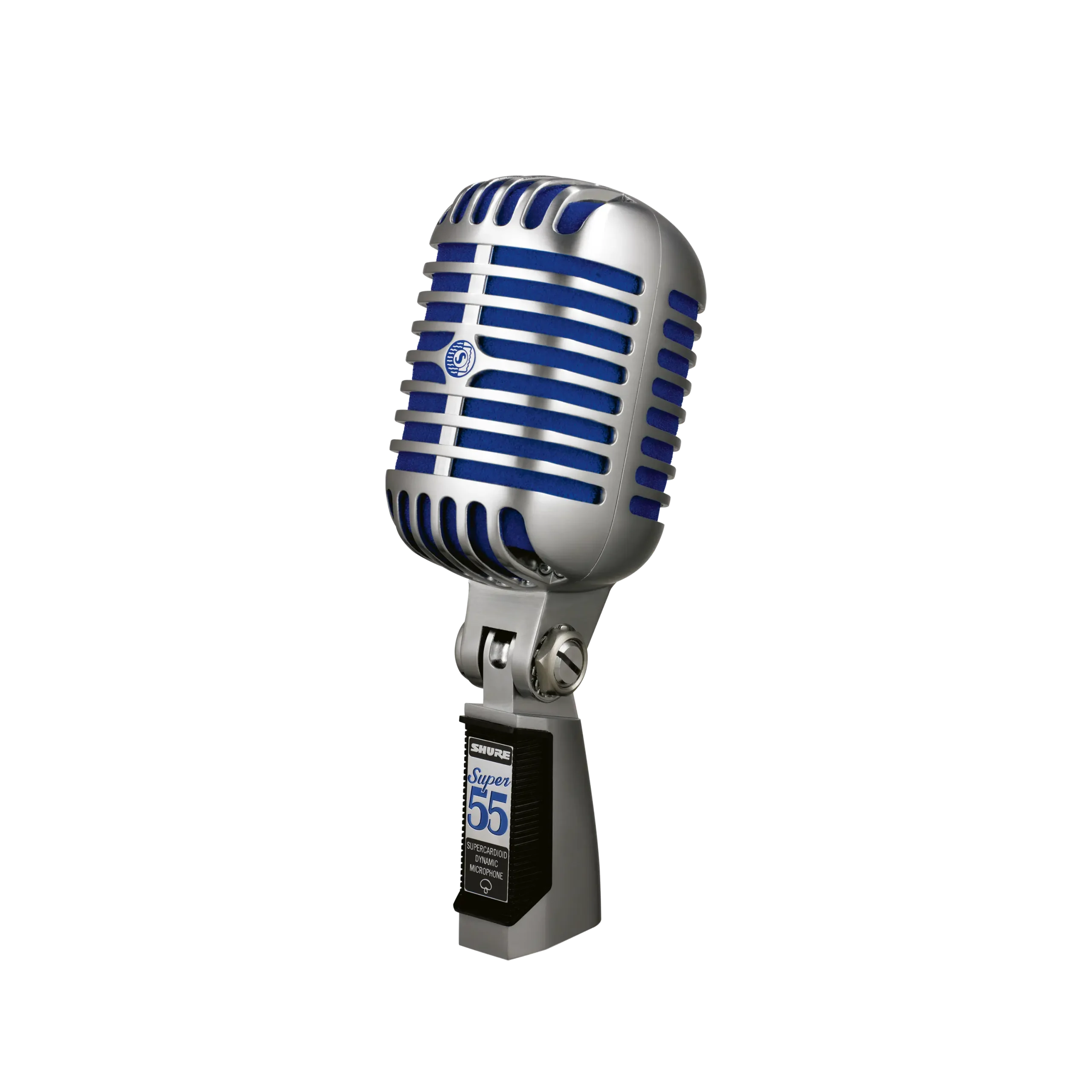 The Super 55 Deluxe Vocal Microphone features a signature satin chrome-plated die-cast casing, Supercardioid polar pattern, vibrant blue foam, and tailored frequency response for natural vocals and speech. Integrated, swivel stand mount is included.