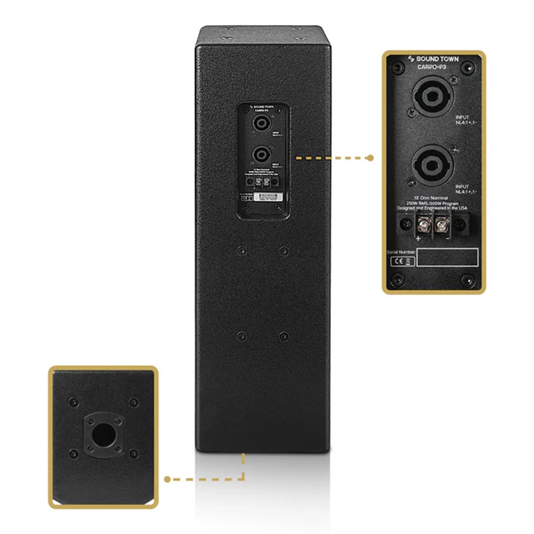 In summary, the Sound Town CARPO-P3B 500W Passive Column Speakers(Pair) deliver exceptional audio performance and versatility for various applications. Their robust construction, flexible mounting options, and high-power output make them ideal for both permanent installations and portable setups. Whether used in auditoriums, places of worship, or live events, the CARPO-P3B ensures clear, balanced sound. This reliable speaker pair combines quality, durability, and ease of use, making it a perfect choice for any audio professional or enthusiast.