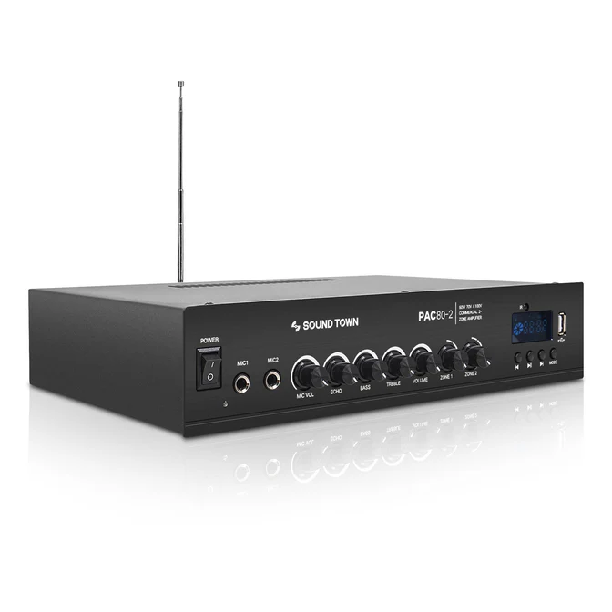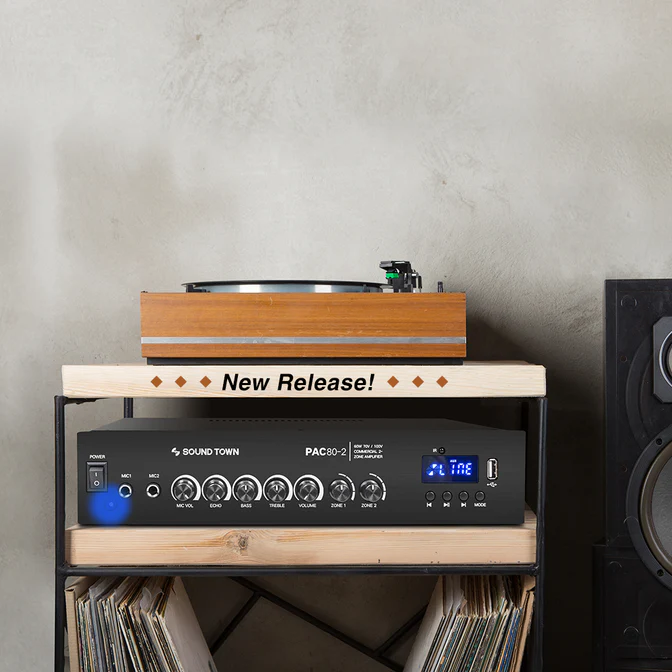 The Sound Town PAC80-2 is a 2-zone compact size commercial power amplifier. It comes with 60W RMS output and can be split into two zones with individual controls. Its integrated clipping limiter protects your speakers and amp from overheating. Even better, it is capable of 70-volt, 100-volt, 16-ohm, 8-ohm, and 4-ohm and is ideal for applications such as restaurants, bars, pubs, schools and warehouse.