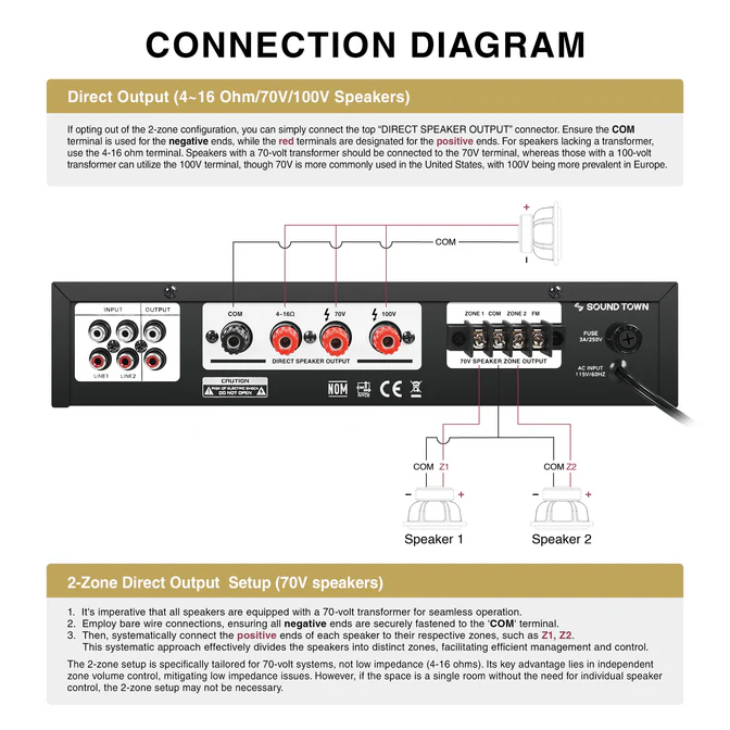 The power amplifier comes with two sets of RCA inputs, two mic inputs, and Bluetooth, USB, FM radio, FM antenna and RCA line output, 70V / 100V / 4~16-ohm red positive speaker output terminals and shared negative speaker output terminal. Its versatile input and output options allows you to easily set this up in a variety of multi-room applications. Each of the two mics input has echo control all two zones have separate volume knobs for easy adjustment.