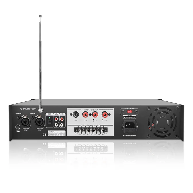 The multi-zone power amplifier comes with RCA input, 3 mic inputs, Optical (SPDIF) input, and Bluetooth, USB, FM radio, FM antenna and RCA line output, 70V / 100V / 4~16-ohm red positive speaker output terminals and shared negative speaker output terminal.