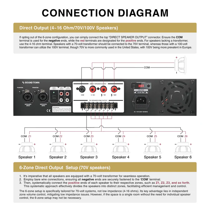- The commercial (public address) power amplifier has a 6-zone speaker output with individual volume control