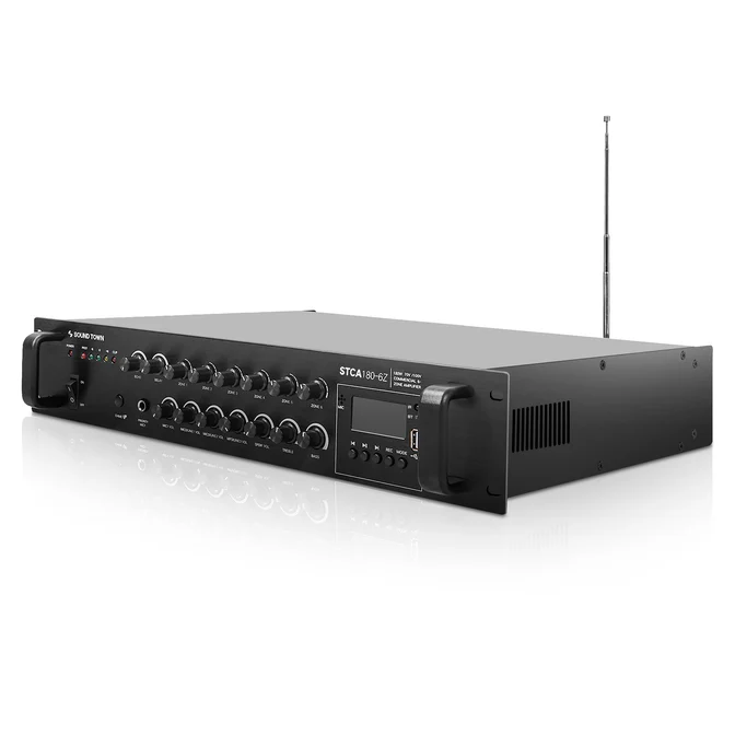 The Sound Town STCA180-6Z is a 6-zone 19” rack mountable commercial power amplifier. It comes with 180W RMS output and can be split into 6 zones. Its integrated clipping limiter protects your speakers and amp from overheating. Better yet, it is capable of 70-volt, 100-volt, 8-ohm, and 4-ohm and is ideal for applications such as restaurants, bars, pubs, schools and warehouse.