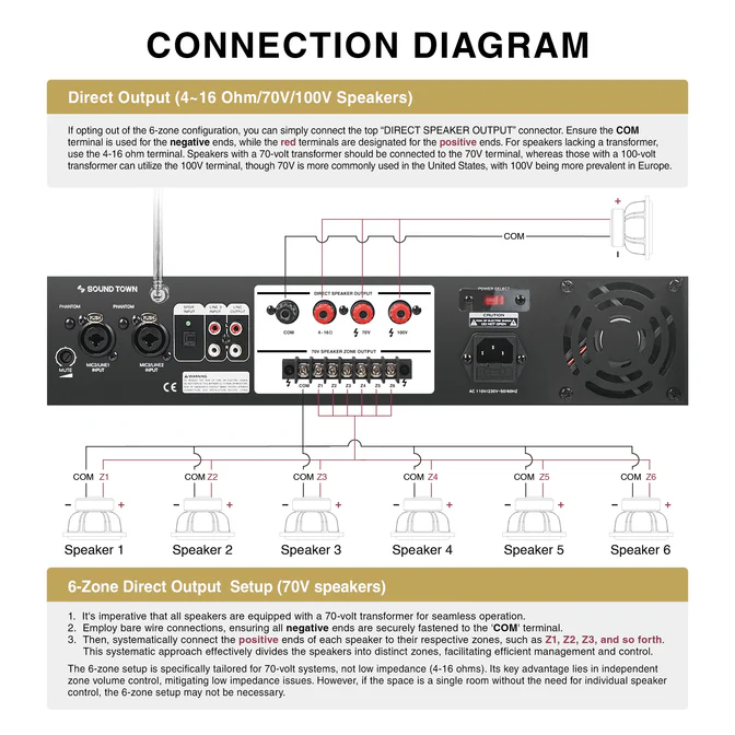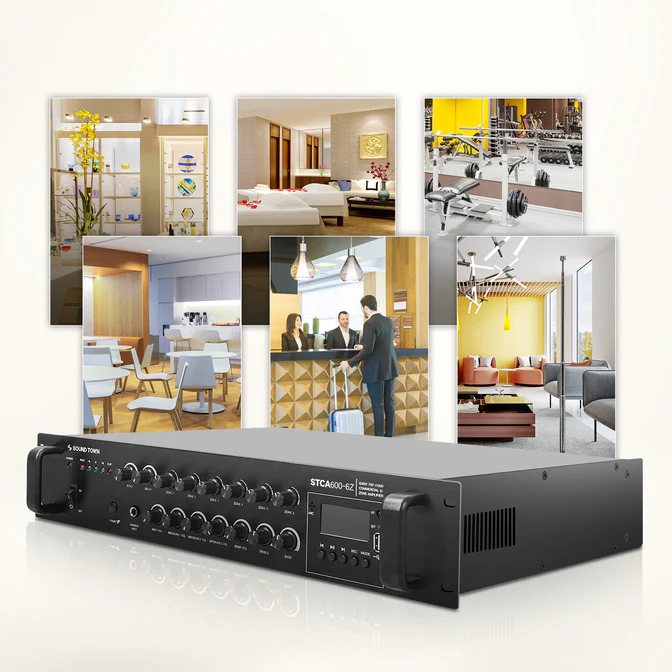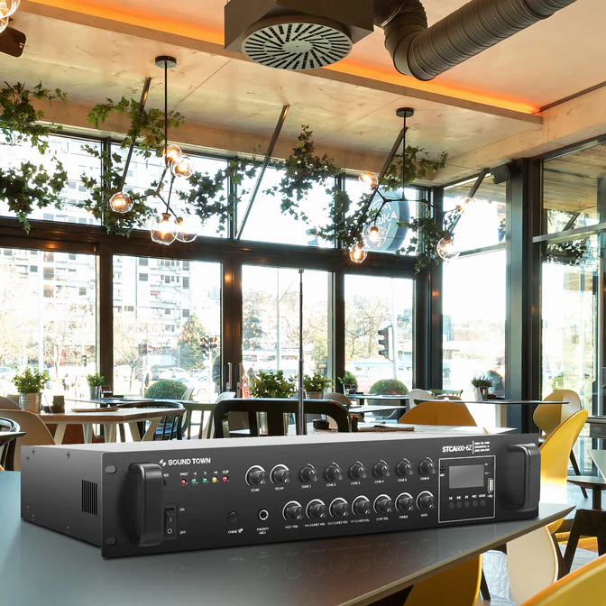 The Sound Town STCA600-6Z is a 6-zone 19” rack mountable commercial power amplifier. It comes with 600W RMS output and can be split into 6 zones. Its integrated clipping limiter protects your speakers and amp from overheating. Even better, it is capable of 70-volt, 100-volt, 8-ohm, and 4-ohm and is ideal for applications such as restaurants, bars, pubs, schools and warehouse.