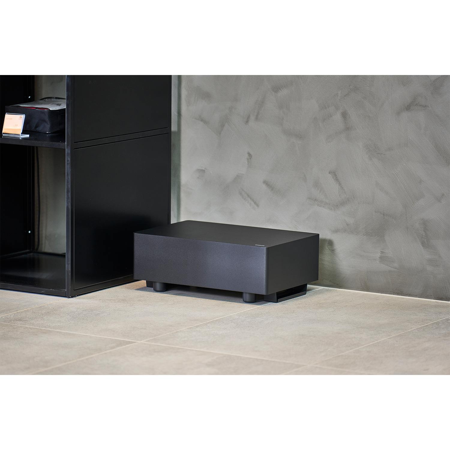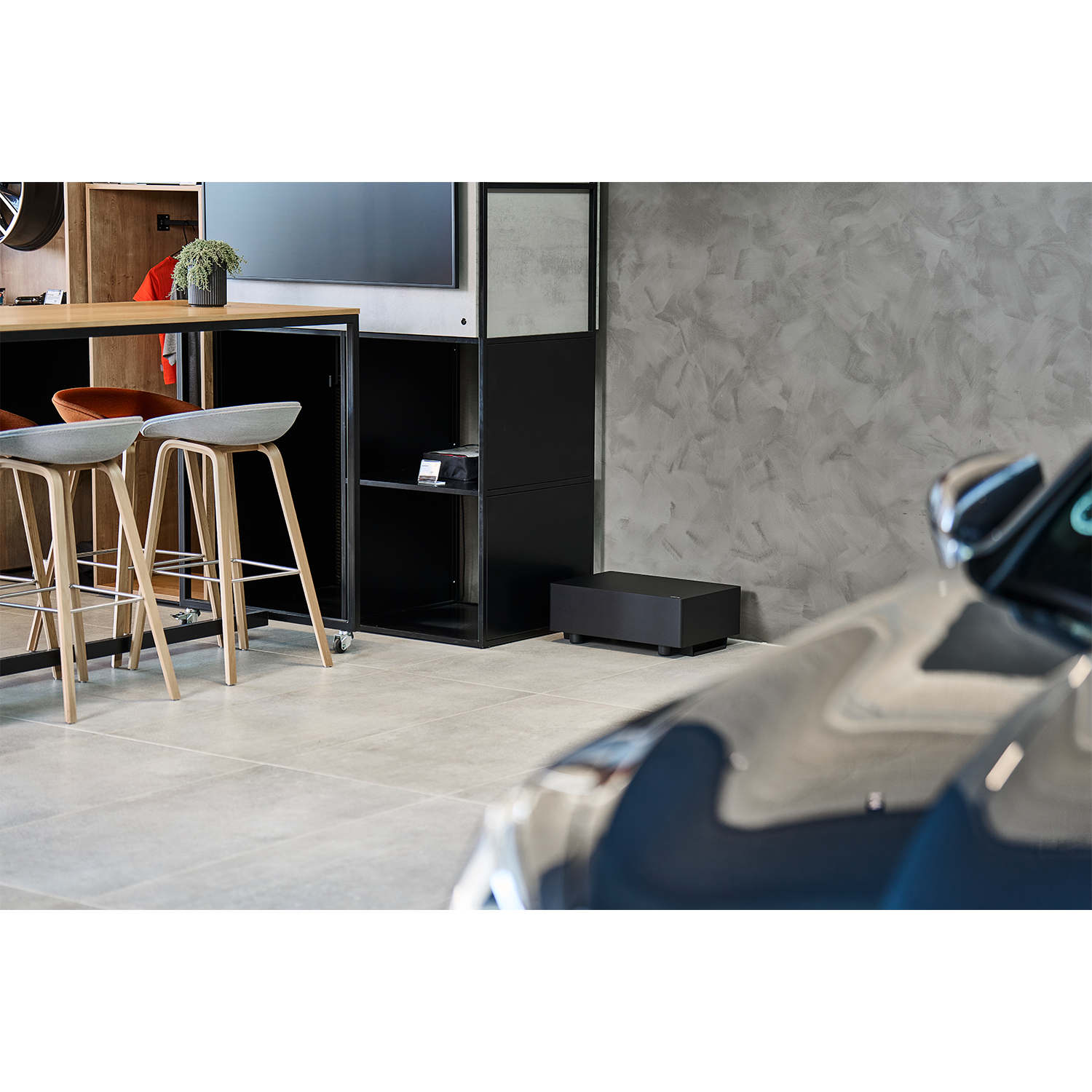 The subwoofer is designed to be set up in minutes and seamlessly compatible with Omni speakers. Encased in a closed box, this subwoofer operates wirelessly, adding a robust bass element to enhance the depth of the sound produced by the speakers, thereby elevating the overall music experience. Its purposeful design ensures that it effortlessly integrates into the audio setup, contributing a rich and immersive quality to the auditory ambiance.