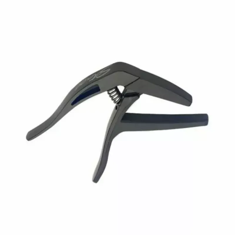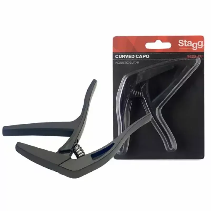 The Stagg SCPX-CU Curved Trigger Capo in black is designed for fast, accurate key changes on guitars with a curved/radiused fingerboard. Its spring-loaded trigger mechanism allows for quick one-handed placement, while the durable metal body and protective rubber padding ensure even pressure across the strings without damaging your instrument.