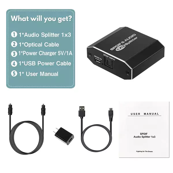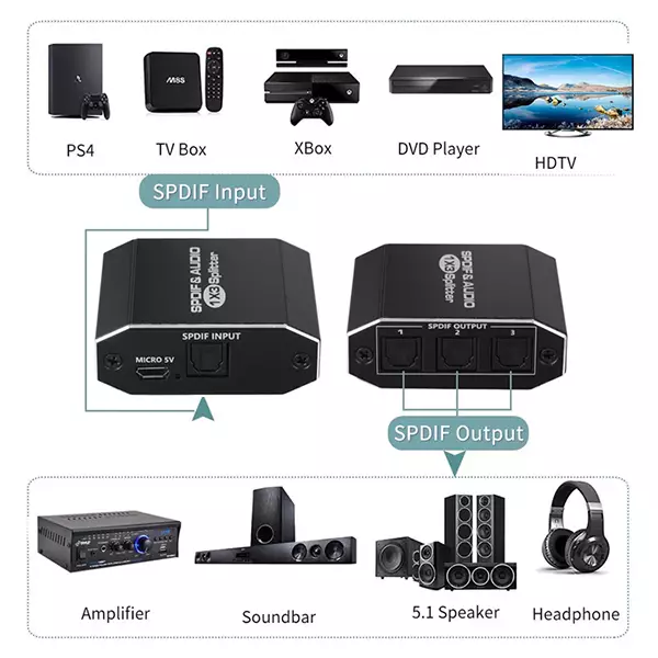 - One way of optical fiber signal input splitter to three sets of SPDIF/TosLink signal receiving device