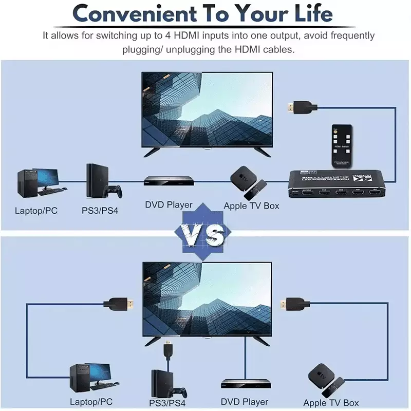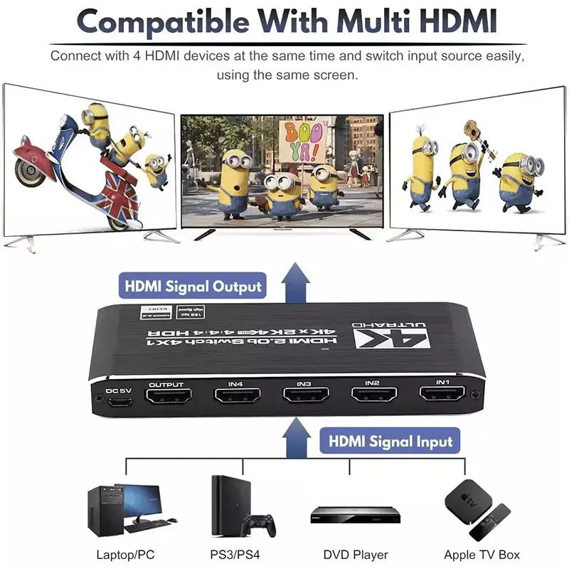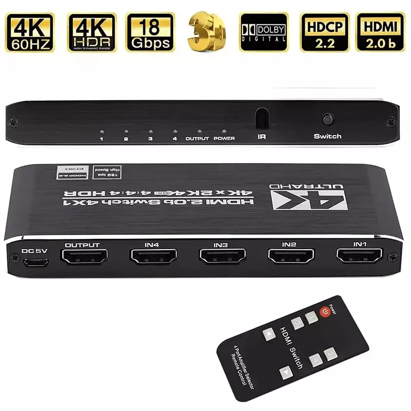 The 4-port HDMI switch supports HDR10 and HDCP 2.2 (backward compatible with HDCP 1.4 and 1.3). It also supports HDMI 2.0b (RGB 4:4:4) and deep color with 36 bits per channel. With a resolution of 4K at 60Hz, it accommodates various devices such as Amazon Fire Stick, Apple TV, gaming consoles, laptops, and more. It features an auto-switch function with remote control, seamlessly transitioning between HDMI sources. Additionally, it ensures Ultra HD resolution, supporting 4K x 2K at 60Hz, Full HD, Full 3D, and various other formats for a superior viewing experience.