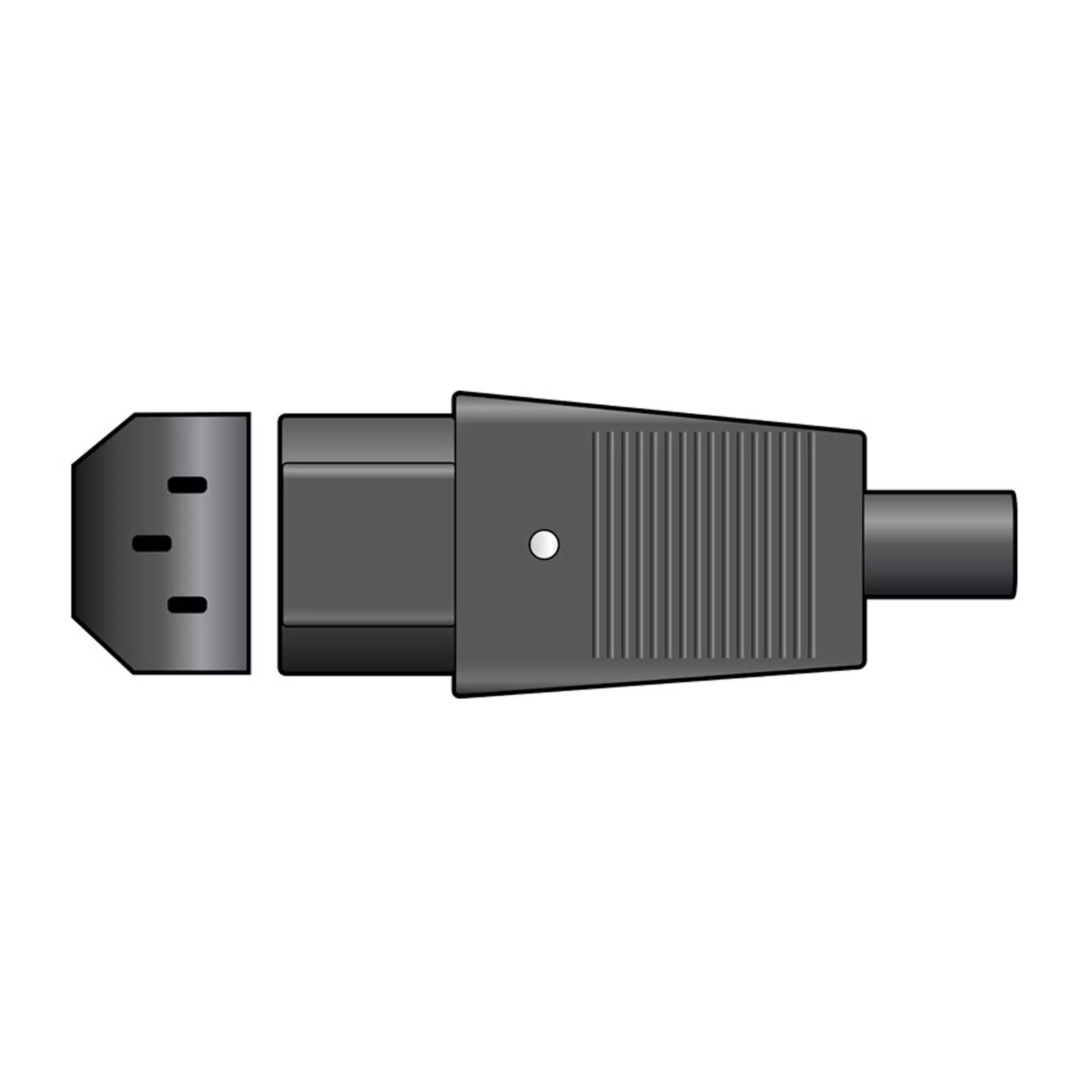 3-pin IEC in-line socket, 250Vac/6A with rubber cable protector and strain relief. For cables up to 8mm.