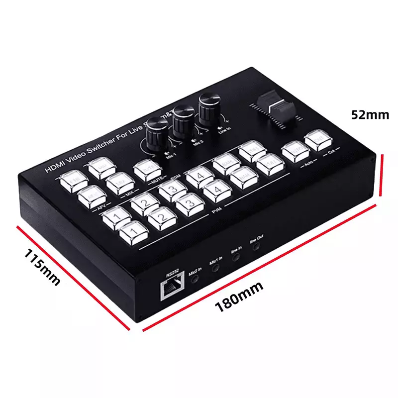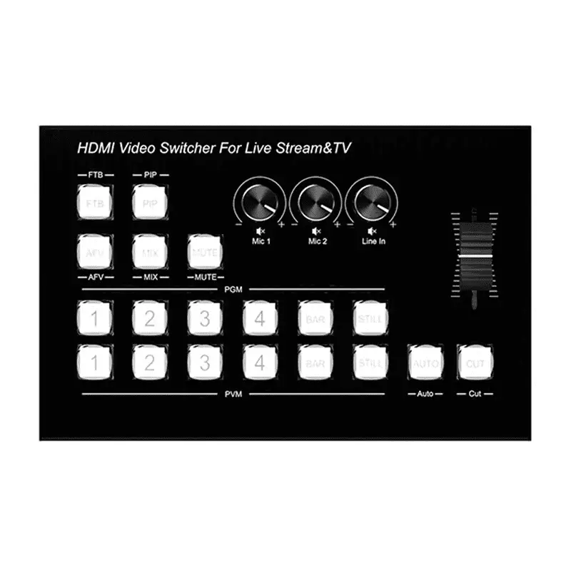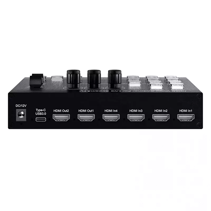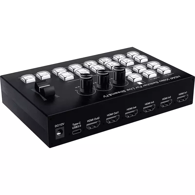 The TVA video switcher is designed for live streaming and supports 4 HDMI inputs with a resolution of up to 4K@30Hz, as well as the HDCP 1.4 standard. It supports both HD embedded audio and external analog audio, which, after mixing, can be either embedded into the output HD signal or output through the analog port. The switcher automatically adapts to the resolution of the input signal, with an output resolution of 1920×1080@60Hz. It meets the needs of radio and television program production, live interview and speech broadcasts, outdoor events, school courseware production, and other video switching applications. This switcher is ideal for use in live streaming and various event venues.