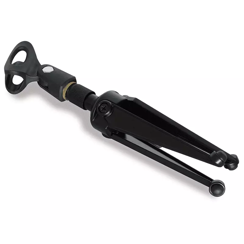A sturdy microphone stand, with 3 foldable legs, for reproducers and instruments which are placed close to the floor. Height adjustable. Plastic microphone holder with 3/8″ and 5/8″ thread adaptor. The holder is suitable for most microphones.