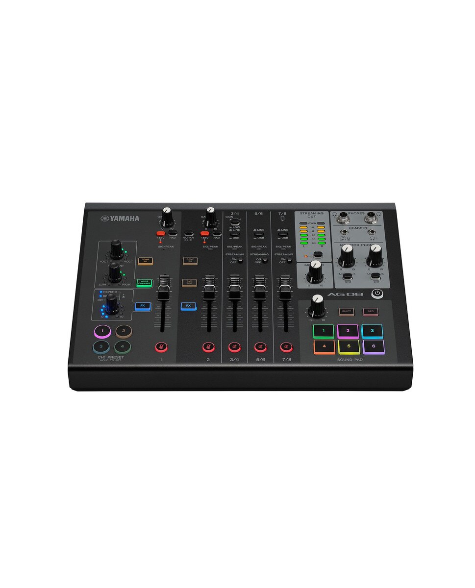 As the flagship model of Yamaha’s second-generation AG series lineup, the AG08 Mixer combines all the essential functionality of its predecessors with a versatile selection of practical new features to give you a powerful all-in-one streaming station. By integrating more flexible I/O and USB routing options, expanded footswitch functionality, additional DSP effects, and improved internal circuitry for class-leading sound, the AG08 is able to support an impressive array of live-streaming applications, offline audio-content creation—including single- and multiple-user talking—gaming, ASMR, voice acting applications, and vocal/instrument performances.