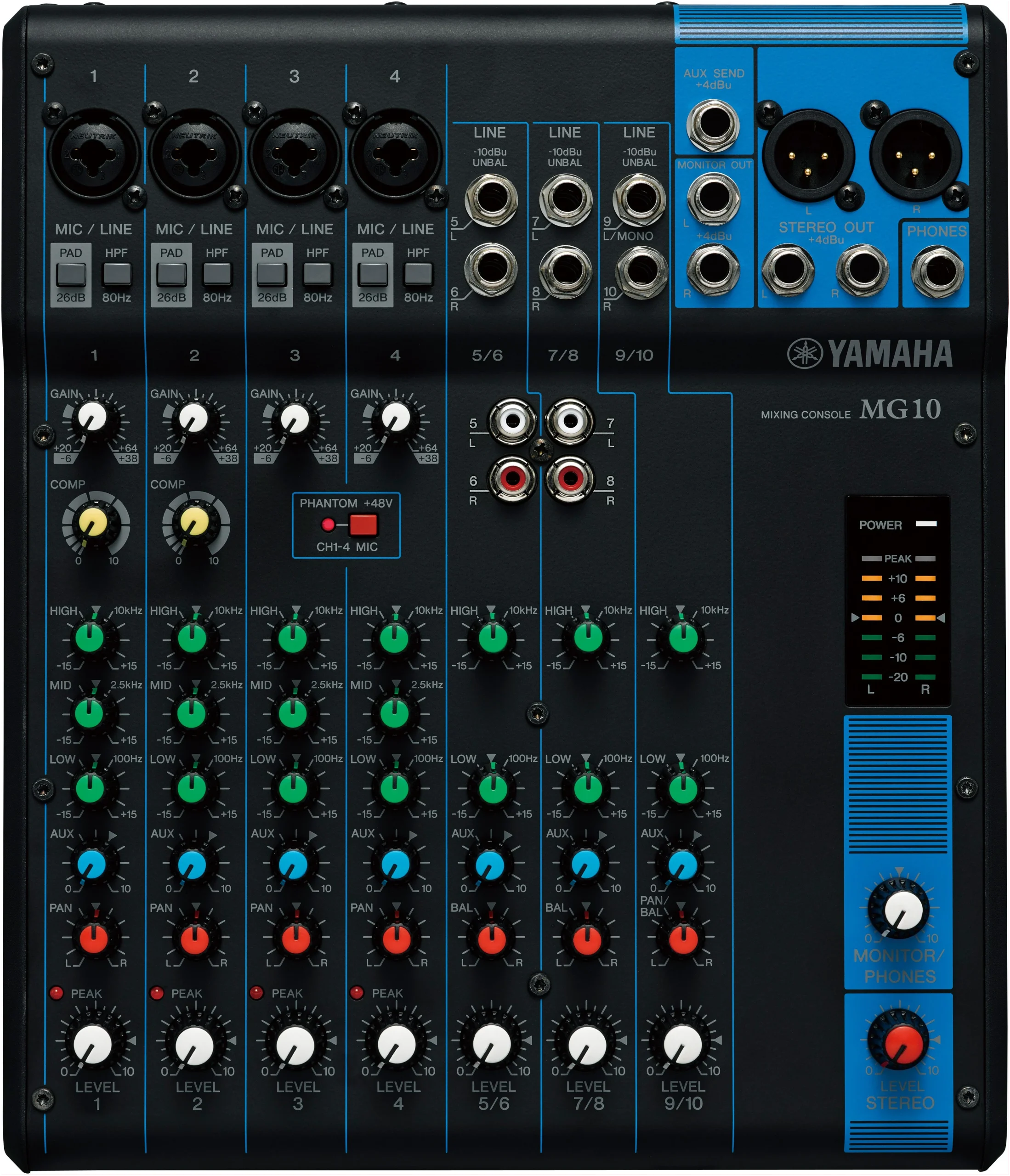 10-Channel Mixing Console: Max. 4 Mic / 10 Line Inputs (4 mono + 3 stereo) / 1 Stereo Bus / 1 AUX
