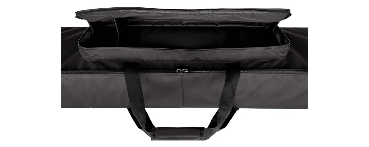 Large accessory pocket for storage of cables, pedals, power supply, and sheet music