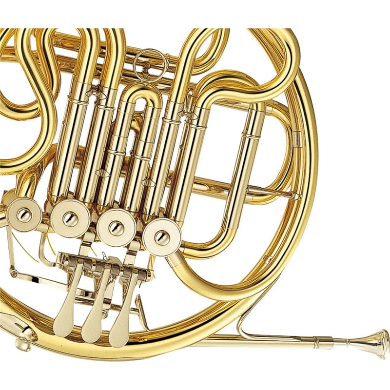 The YHR-567D features a detachable bell and a medium-sized bell throat, contributing to its balanced tone and projection. Its design facilitates smooth transitions between registers, making it ideal for various musical settings. The instrument includes an adjustable 4th valve thumb lever and a water key, enhancing comfort and maintenance ease.